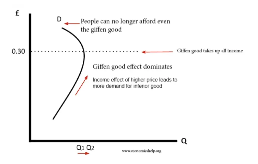 This leads us to a new perspective on what are called Giffen goods. Traditionally, these are goods that are strongly inferior staples (like very cheap bread, rice, or potatoes for the poorest consumers) where a price rise makes people effectively poorer and pushes them to consume more of the cheap staple and less of better foods, so quantity demanded rises with price over some range. The upward slope comes from the income effect outweighing the substitution effect; this pattern generally appears only for very low‑income consumers and over a limited price band, not for the whole market. (The effect is named for Scottish economist Robert Giffen, who observed it in poor households’ food purchases in the late 19th century. It was documented by Alfred Marshall in his 1890 book Principles of Economics.