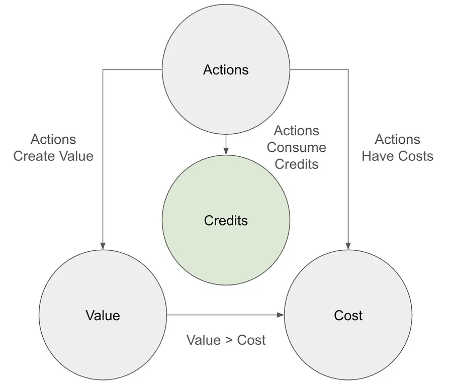 Assign credit counts for all actions and anything else that creates value and generates costs