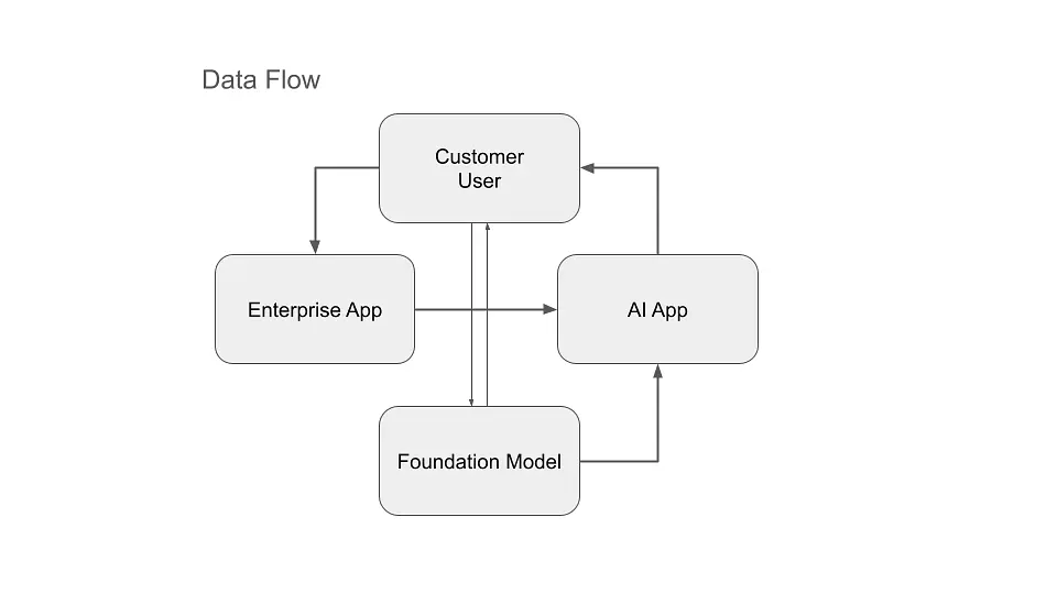 The data comes from the customer and the foundation model. Customer data runs through a cycle from customer to enterprise app to AI agent or app, where it is enriched with one or more foundation models and then fed back to the customer. These cycles lead to conflict about who is really creating the value and how much of that value each participant can claim. We could make this picture even more complicated by adding a direct connection between the customer and the foundation model.