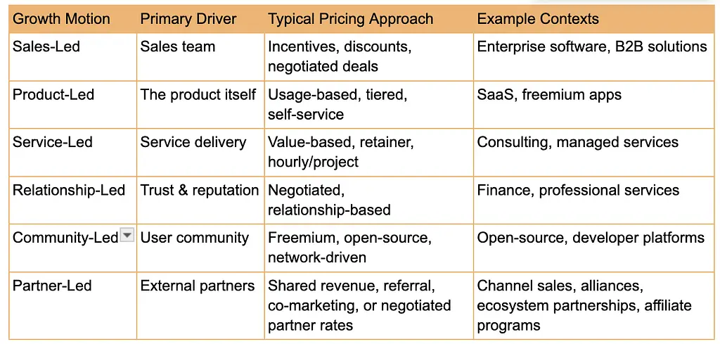 Here, you will want to align your model to that of how your customer will want to engage. Each motion is characterized by its unique approach to acquiring, retaining, and expanding customers, as well as its implications for pricing and organizational processes.