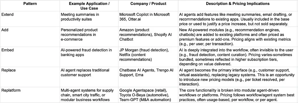 Replace: Existing functionality is replaced by an agent; in many cases, the existing functionality can only be accessed through the agent, which replaces the legacy application. → This is a great opportunity to rethink pricing and introduce new pricing metrics that do a better job of aligning price and value.