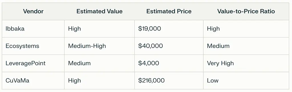 Task 6: Generate a table comparing the four vendors (Ibbaka, Ecosystems, LeveragePoint, CuVaMa) on value, price and probability of achieving goals.