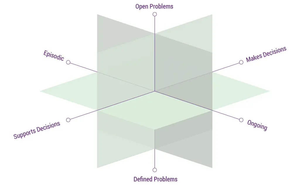 There are emerging patterns for applications in six quadrants of the eight quadrants. That leaves two quadrants to be filled and it will be interesting to see what emerges. The open quadrants are for decision making for open problems (whether episodic or ongoing). This may rely on the eventual? emergence of more general forms of AI. The current generation of AI and those on the current trajectory are not suited for final decision making on open problems although there are approaches like concept blending and scenario planning where generative AI can help.