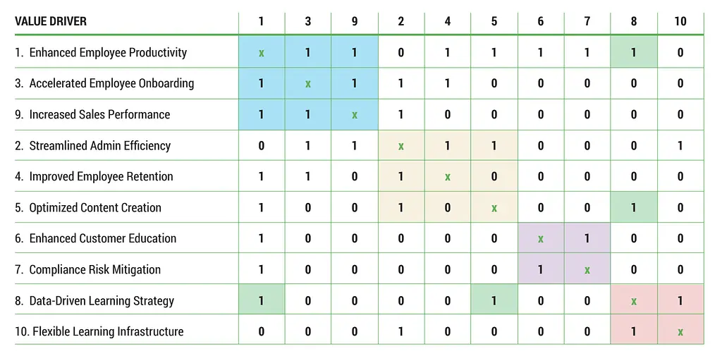 These six companies were selected by our AI as key vendors in the Learning Space (there are many others). Ibbaka used its AI-based Value Model Generation approach to create generic value models for each of these companies and then combined them to create a general value map for the category. You can learn more about this process in our post Category Value Maps define positioning and differentiation.
