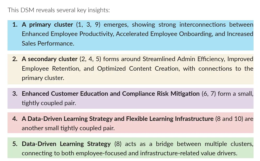 Generating a DSM based on value drivers is a new tool, made practical by generative AI. It gives an external view of the underlying connections between different value drivers. Understanding this can help companies look deep into how they create value for their customers.