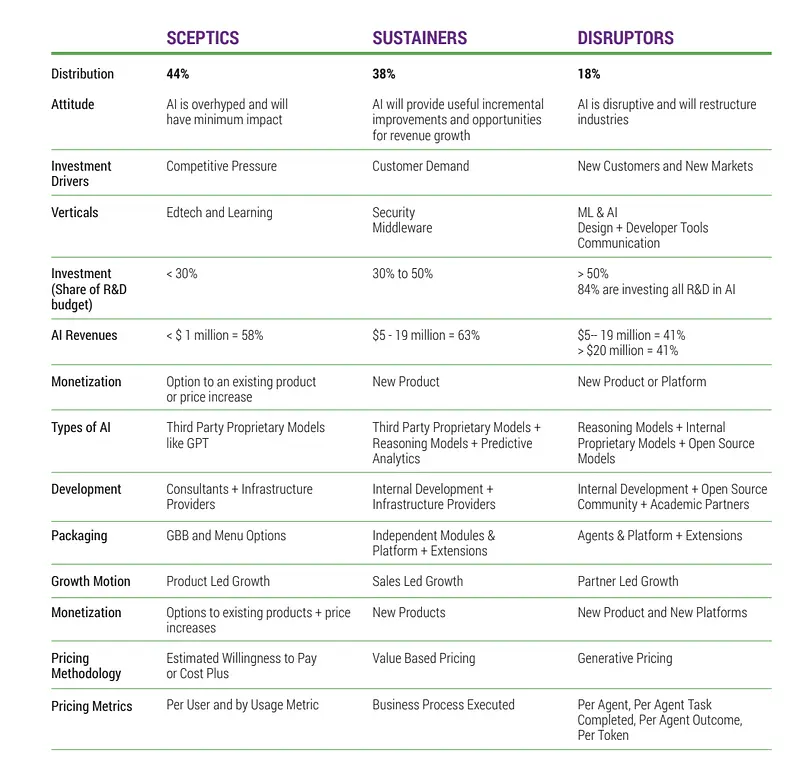 The report's clustering of companies into Skeptics, Sustainers, and Disruptors could be compared with other market segmentation studies in the AI industry.