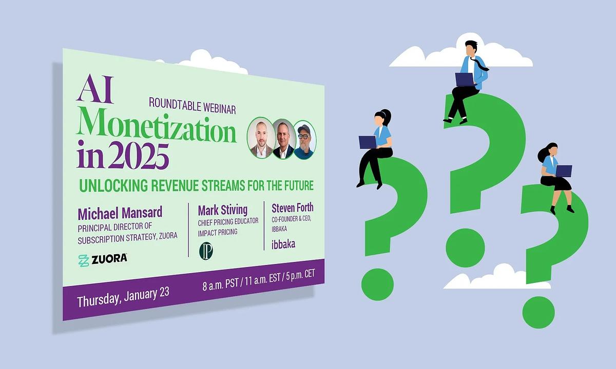 On Thursday, January 23 at 11:00 AM Eastern (8:00 AM Pacific / 5:00 PM Paris) we will have a webinar with value and pricing experts Mark Stiving (host of the essential Impact Pricing Podcast) and Michael Mansard from Zuora. They will ask their questions about the report and draw out the trends that will shape value, packaging, and pricing in 2025.
