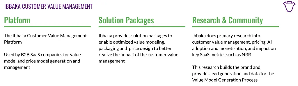 Ibbaka is c customer value management (CVM) platform vendor. Our approach is built on the generation of value models and their integration with value stories and pricing models. We bring value and pricing together to help companies accelerate revenue growth and get a fair price for the value they are delivering.