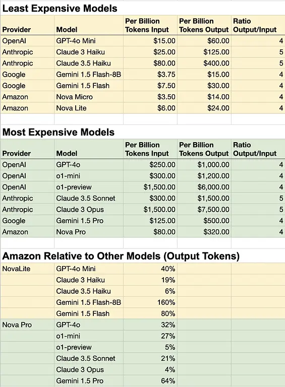 Amazon is also offering its own foundation models under the name Amazon Nova. Setting aside performance questions, how does the pricing compare with other models?