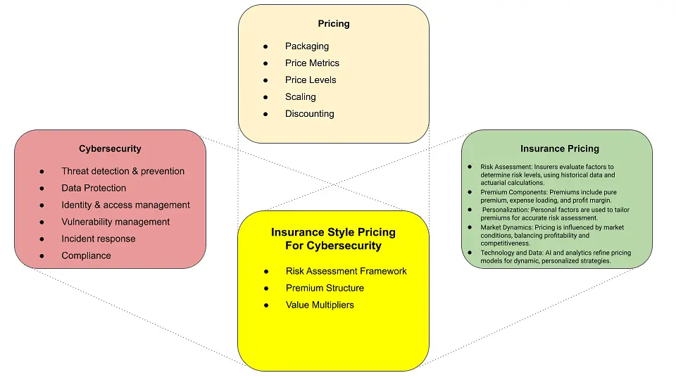 One way to combine ideas from two different disciplines to create something new is concept blending. In this approach one has an overall domain (in this case pricing) that is used as a frame and then two things that one wants to blend, in this case cybersecurity and insurance pricing.