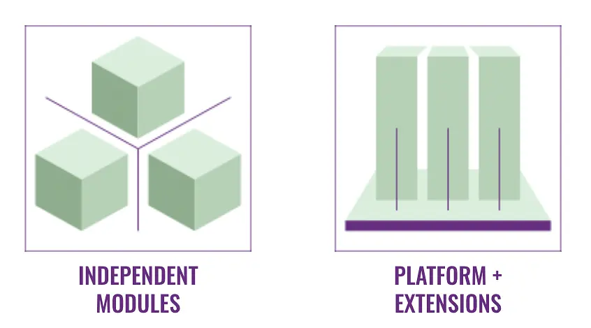 The Independent Modules pattern is common as companies add new products or grow through acquisition. It is often possible to define dependencies or paths between modules to drive cross-sell and modules can be bundled in different ways to support different use cases.