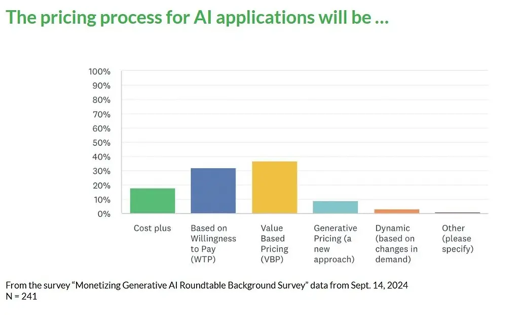 We can see below that just under 40% of respondents believe and feel that the pricing process for AI applications will be going through the value based pricing route, with just a little more than 30% saying they’ll be priced on willingness to pay.
