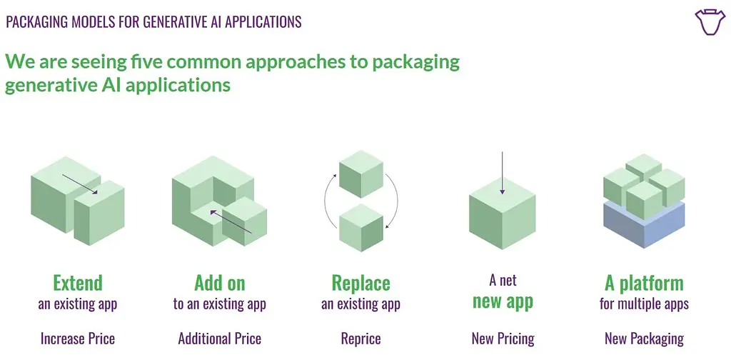 Below are the 5 different patterns in how people are packaging generative AI applications. Michael has important thoughts on what’s happening in the market as well - we’ll dig deeper into this very soon.
