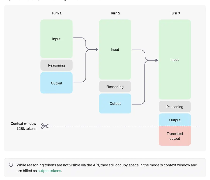 Reasoning tokens count as part of context window usage (an impediment to performance) and will be charged as output tokens.