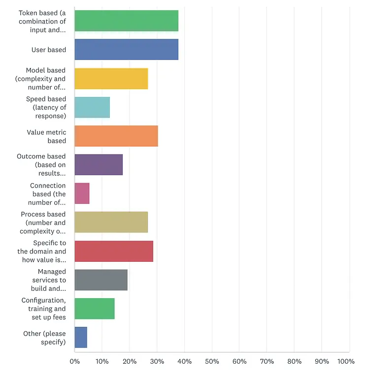 Other metrics that are more associated with vertical applications include process-based and domain-specific pricing. Almost 20% called out managed services, which suggests that part of the market, probably serving enterprises, will provide customized solutions integrating multiple applications and models.