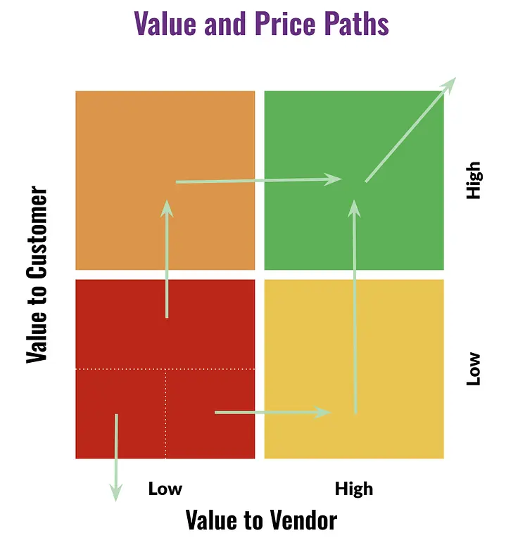 These are your best customers. And you are a great vendor for these customers. They are getting a lot of value and you are getting a lot of value in return. Your goal here is to keep customers in this quadrant and to continue to grow value to customer (V2C) while increasing prices.