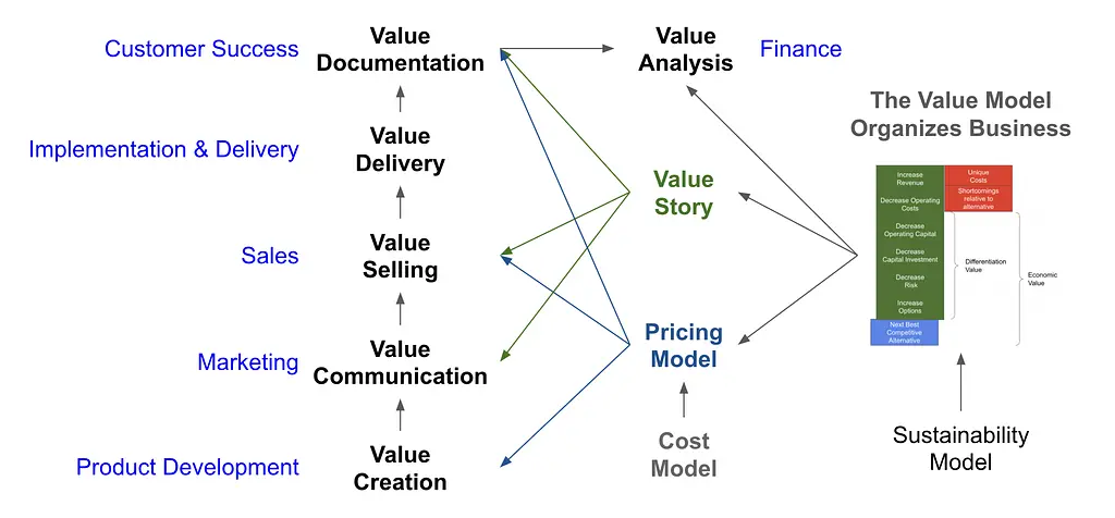 There is a natural flow from product development, through product marketing, to sales, then implementation and delivery, and finally customer success. These define the customer journey. Many companies struggle to connect these different processes as they lack a shared language to talk to each other. Value provides that common language.